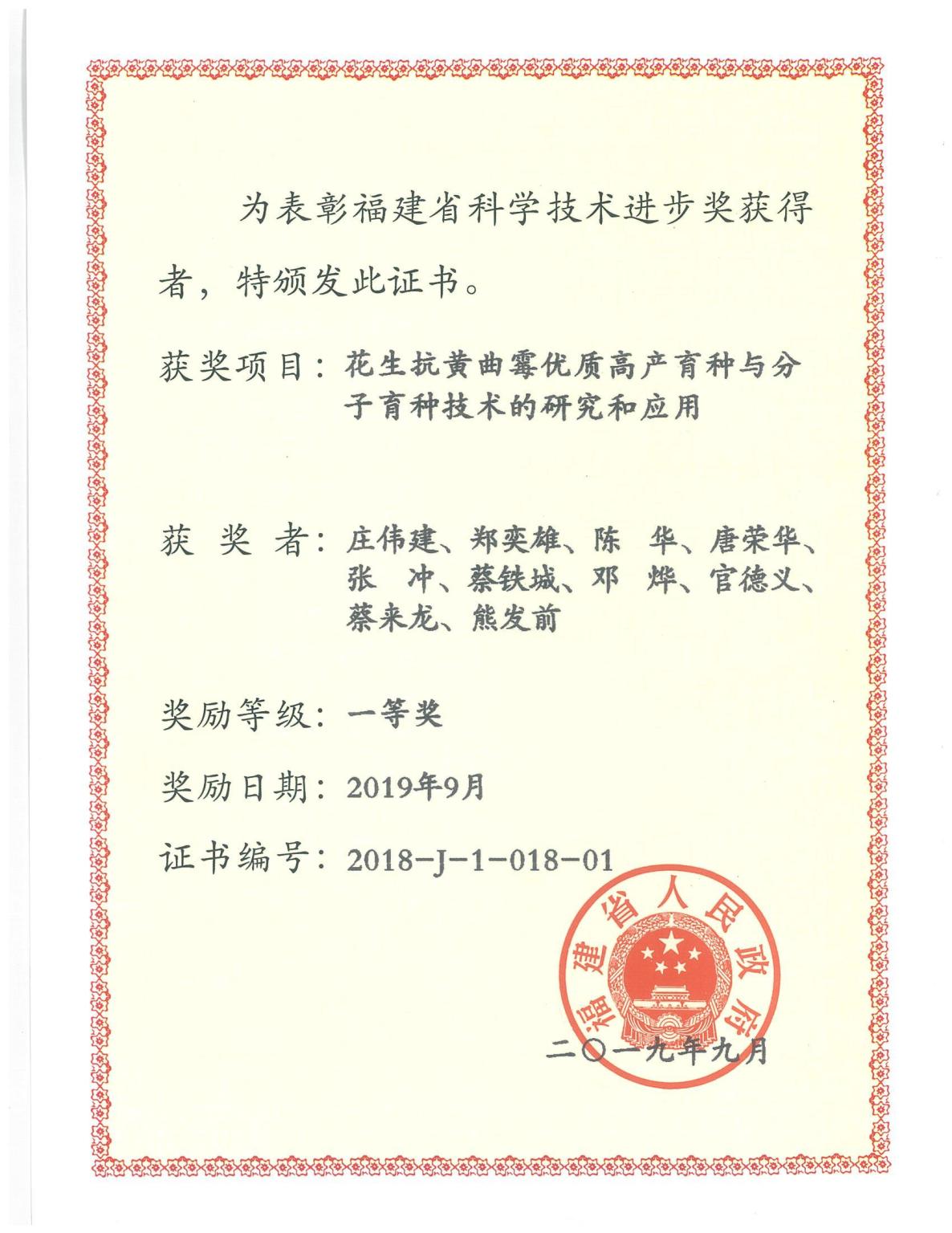 近日,我校参与完成的“花生抗黄曲霉优质高产育种与分子育种技术的研究与应用”,荣获二〇一八年度福建省科技进步奖一等奖。这是从日前福建省人民政府公布的2018年度省科学技术奖励名单上获悉的,该成果由福建农林大学、WilliamHill中文、广西壮族自治区农业科学院经济作物研究所共同完成,我校为第二完成单位、郑奕雄教授为第二完成人。