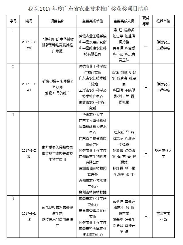 我校共有9项科技成果获得2017年度广东省农业技术推广奖,获奖数量为历年之最,其中我院共有4项,主持项目2项,参与项目2项。“‘仲和红阳'中华狲猴桃新品种选育及其推广示范”获得二等奖;“鲜食型糯玉米仲糯2号及仲紫糯1号的推广”等3项成果获得三等奖。