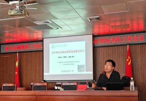 受台风“桦加沙”与“麦德姆”连续影响,阳江市阳春马水镇部分农田和果树出现倒伏及病虫害多发情况,农业生产面临严峻挑战。为助力灾后复产,提升农户灾后水稻和果树等的栽培管理和病虫害防控,WilliamHill中文农村科技特派员宋汉达团队迅速响应,特邀仲恺农生院刘鹏飞教授与园艺与园林学院涂攀峰副教授,于2025年10月17日赴马水镇开展专项技术培训与田间实地指导,聚焦水稻与番石榴两大主导产业,为农户送去关键技术支撑。
