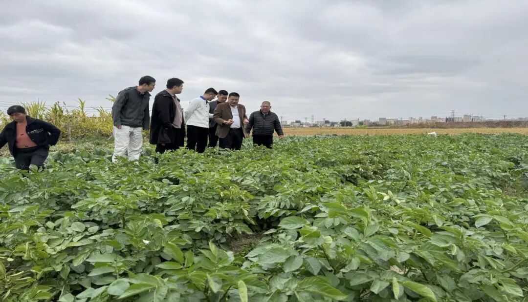 在汕头市鑫雄种植有限公司马铃薯和蔬菜种植基地,特派员团队调研了公司冬种作物生长情况,就低温天气下蔬菜,马铃薯等作物的防寒减灾工作,进行指导和帮助,并对春耕备耕的生产进行探讨。陈青春副教授指出,要加强田间管理,增施钾肥,在寒潮来临前,喷施防冻剂或磷酸二氢钾等抗寒叶面肥,提升农作物的抗寒能力。前期高温造成部分马铃薯叶片枯萎,建议及时采收、销售。