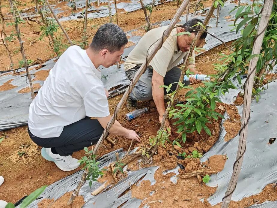 随后,团队前往种植基地查看了牛大力的生长态势,针对种植密度、水肥管理、土壤养护、病虫害预防等关键环节逐一研判,提出了标准化、精细化的种植建议。团队赠送给基地的光合高脂膜药剂,是一种能够促进牛大力块根膨大、提升产量与品质的新型高效制剂。胡黎明老师为种植户讲解了药剂的作用机理、施用时机、操作要点及注意事项,确保种植户看得懂、学得会、用得上。