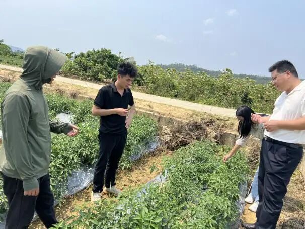 团队紧接着奔赴船步镇船东辣椒种植基地。当前正值辣椒生长关键期,但部分田块出现了叶片病斑、果实腐烂等现象。团队通过问询和仔细查看病株后指出,炭疽病是当前威胁较大的病害,阴雨潮湿天气会加剧其蔓延。团队成员现场指导农户识别病害典型症状,并提出了以“健康栽培为基础、预防性施药为重点”的综合防控方案,科学选用高效低毒药剂(甲霜·恶霉灵[10%+20%]水剂,寡糖·噻唑膦[1%+9%]颗粒剂混合施用)等,强调抓住雨前雨后关键窗口期进行保护。