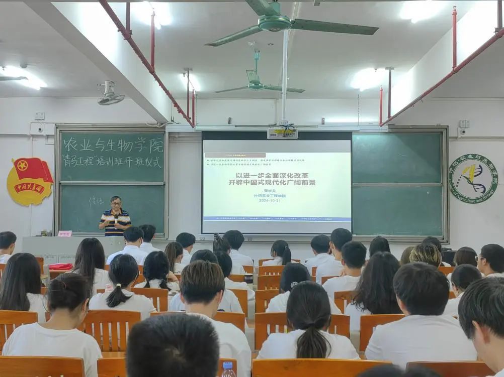 随后,“青马工程”培训班第一课开讲,由曾学龙以“进一步全面深化改革,开辟中国式现代化广阔前景”为主题进行授课。曾学龙结合具体事例,从“党的二十届三中全会精神回顾”“进一步全面深化改革的意义”“进一步全面深化改革的逻辑进路”“大学生如何学习理解《决定》”等四个方面展开讲解,环环相扣、深入浅出。他提出,大学生作为新时代青年,要深入学习贯彻党的二十届三中全会精神,明确在推进中国式现代化进程的使命和责任,在推进中国式现代化进程的过程中实现自己的理想抱负。