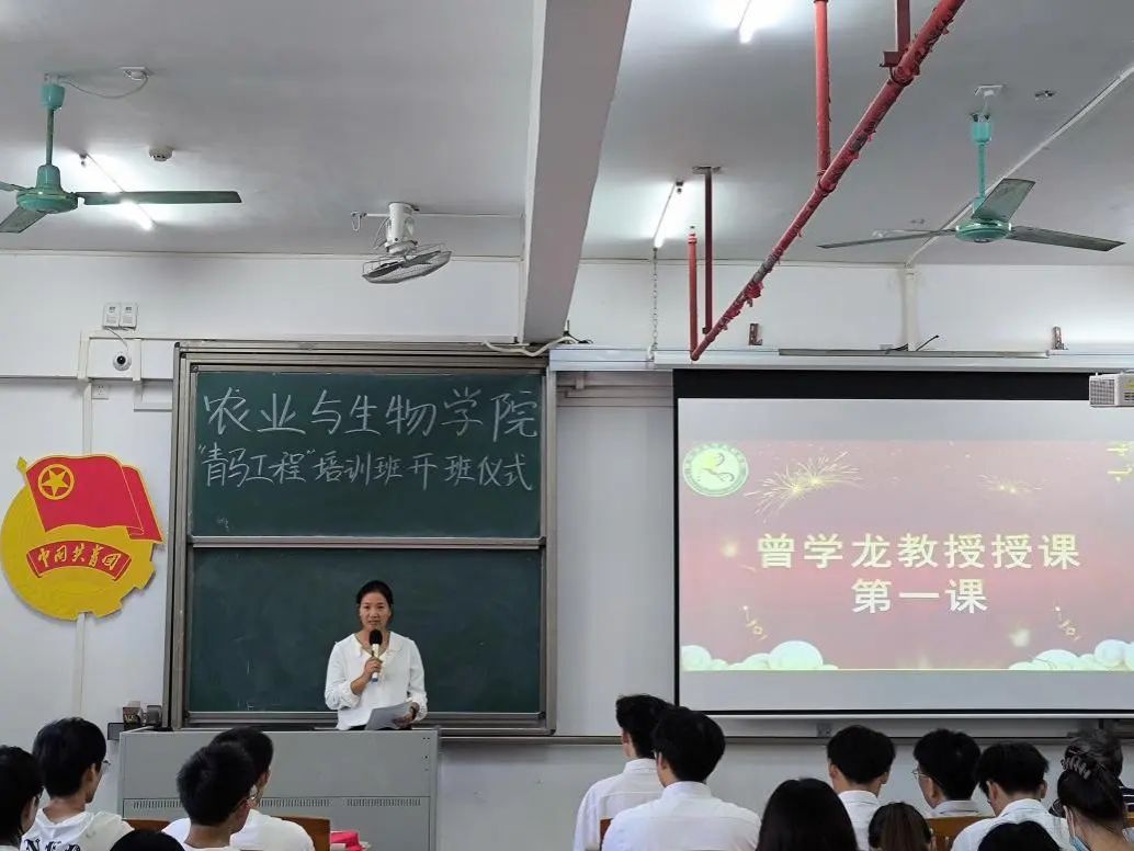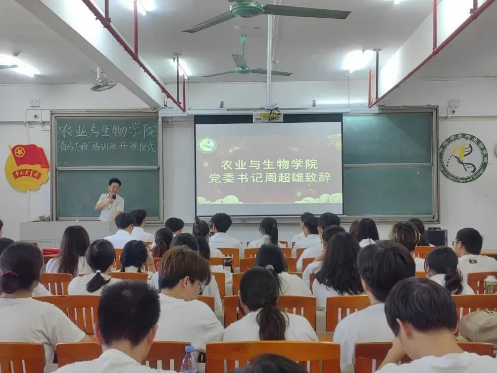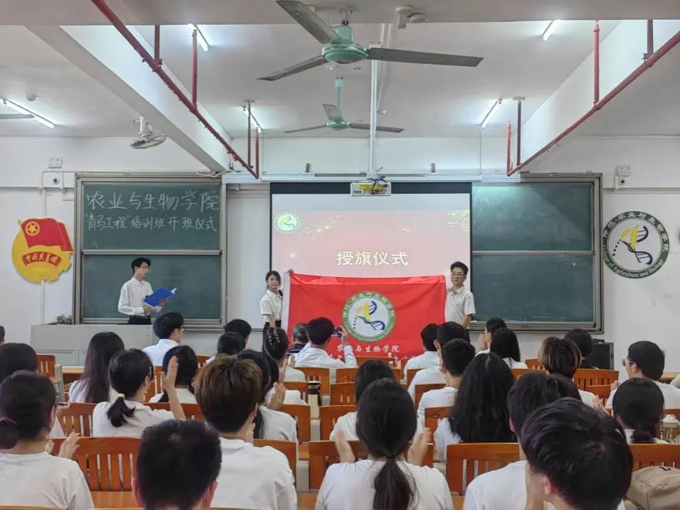 开班仪式开始,“青马工程”培训班学员代表黄金辉向大家宣读培训班的班级须知,规范班级的纪律要求。接着,周超雄为“青马工程”培训班学员代表陈铭昕授旗并做致辞,他对培训班的开班表示祝贺,并在举办培训班的目的和意义、对培训班成员期望等方面进行了阐述。周超雄指出:一是把参加集中培训和长期自学结合,政治上的坚定来源于理论上的清醒;二是把树立远大志向与选择正确成长路径结合起来。三是把理论学习与实践锻炼相结合,发挥桥梁纽带作用,建设优良学风、班风、院风。小我融入大我,心系家国情怀,真正为中国式现代化贡献青春力量。周超雄希望通过系统的理论学习和实践锻炼培养一批政治可靠、信仰坚定并且能力突出的青年,这批青年理想信念,加强理论素养,不断深化党的理论认识,不断从中汲取科学智慧和理论力量。