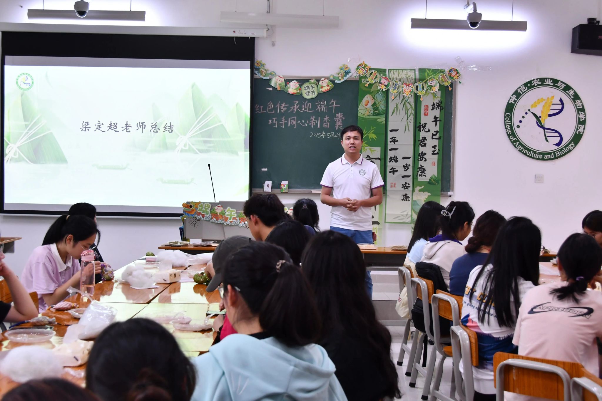 随后,梁定超为本次活动作总结。他强调端午节作为中华民族重要的传统节日,承载着华夏文明的精神内涵,当代青年学子应当自觉传承这份文化遗产。青年学子当以"各美其美"的文化自信,将菖蒲艾叶的清香转化为讲好中国故事的能力。学院举办传统香囊制作活动,旨在通过实践体验增进同学们对端午文化精髓的理解,增强对家国情怀理解,感悟其中所蕴含的深厚人文精神,让这份精神滋养心灵,让传承生生不息。在表达端午安康祝福之后,他还着重提醒全体学生:期末考试在即,务必恪守考试诚信准则,展现新时代大学生的品格修养。