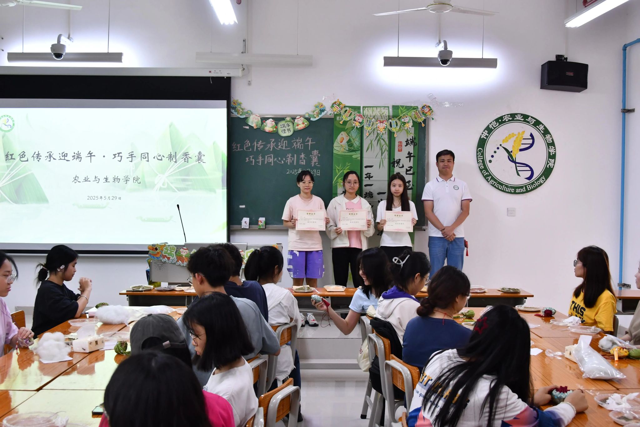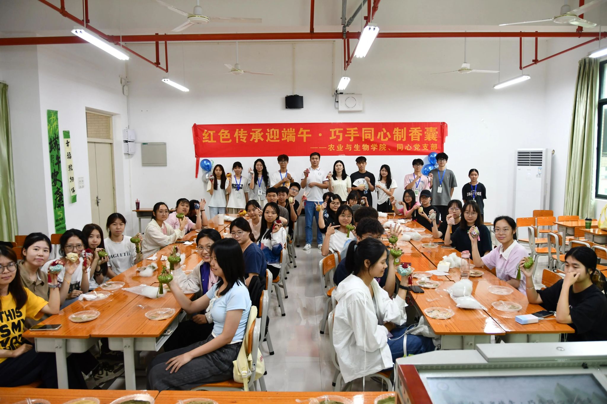 为深入传承弘扬中华优秀传统文化,深切体悟端午节文化意蕴,我院联合社区同心党支部于5月29日下午在生命科学大楼A座508室共同组织开展"红色传承迎端午·巧手同心制香囊"主题文化活动。我院辅导员李城、孙晓芳、邝健睿、梁定超,社区同心党支部书记肖芳芳,团委学生副书记陈铭昕和40余名学院及社区学生共同参加此次活动。