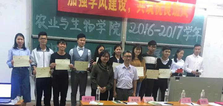 经过一番激烈的比拼,班风展示的评比结果终于揭晓,生科153、种科161、生科141荣获班风展示的第一、二、三名,生科163、农学163、农学162、生科152、植保152、植保161共6个班级获得优秀班集体称号。随后,周书记和高老师为获奖班级颁发奖状。
