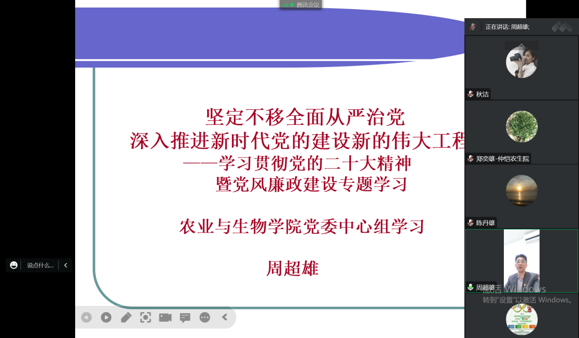 为进一步推进全面从严治党向纵深发展,12月2日晚,william威廉中文党委召开理论中心组学习暨党风廉政建设专题学习会,并围绕“学习贯彻党的二十大精神全面从严治党”进行研讨交流。会议由学院党委书记陈丹雄主持,党委副书记周超雄主讲,学院党委理论学习中心组全体成员参加学习。