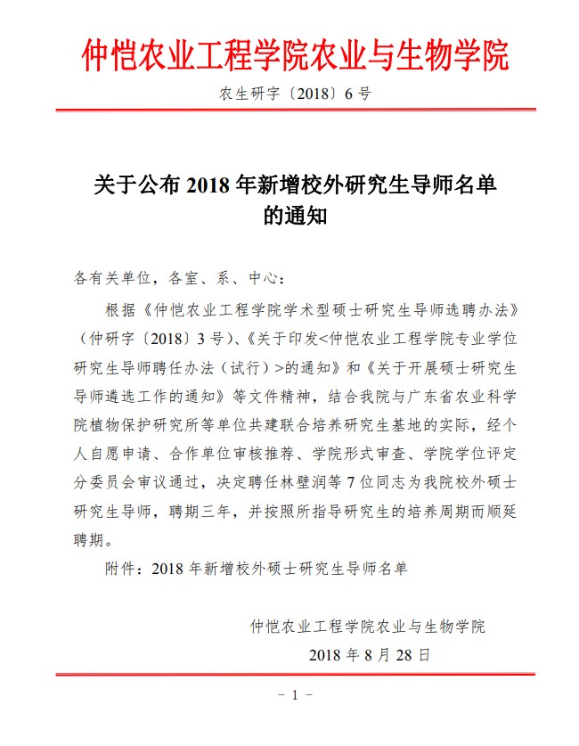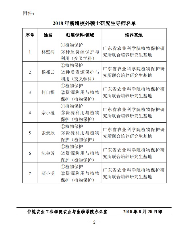 农生研字(2018)6号-植保所-关于公布2018年新增校外研究生导师名单的通知
