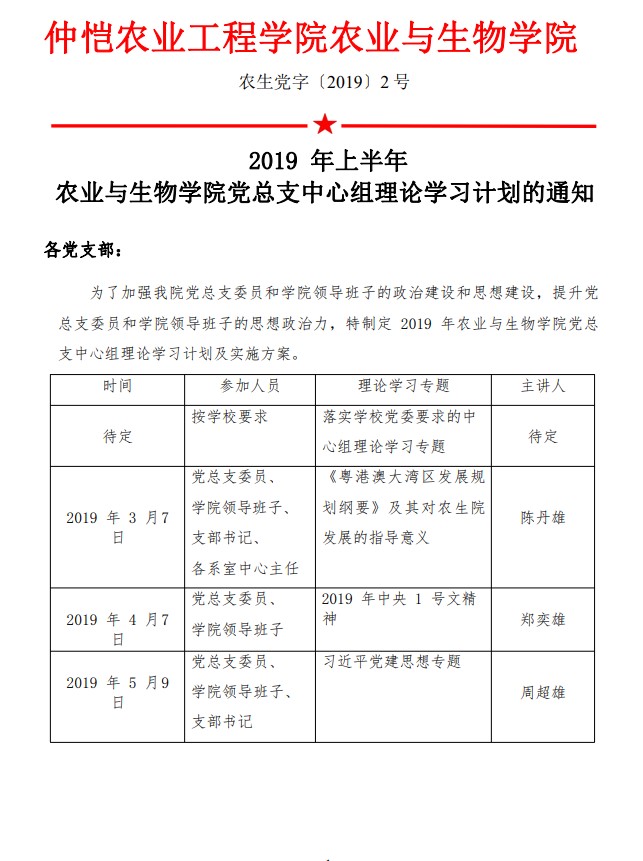 农生党字〔2019〕2号-2019年上半年william威廉中文党总支中心组理论学习计划的通知