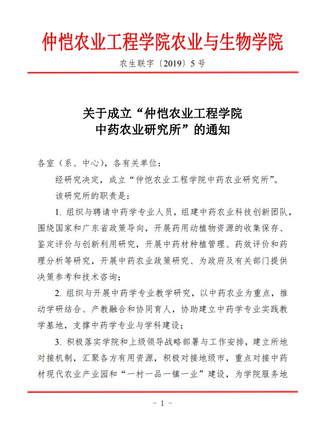 农生联字〔2019〕5号-关于成立WilliamHill中文中药农业研究所的通知