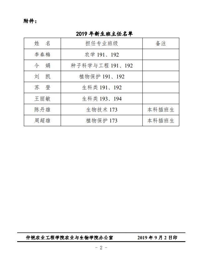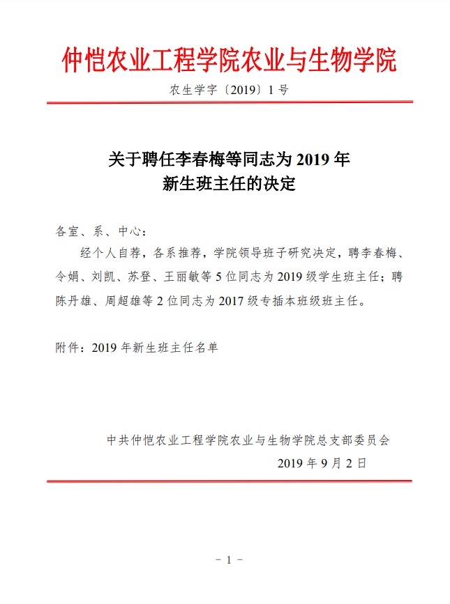 农生学字〔2019〕1号-关于聘任李春梅等同志为 2019 年 新生班主任的决定