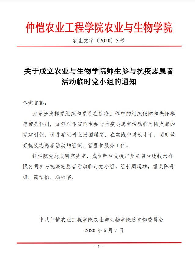 农生党字〔2020〕5 号-关于成立william威廉中文师生参与抗疫志愿者活动临时党小组的通知