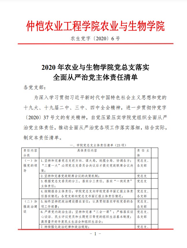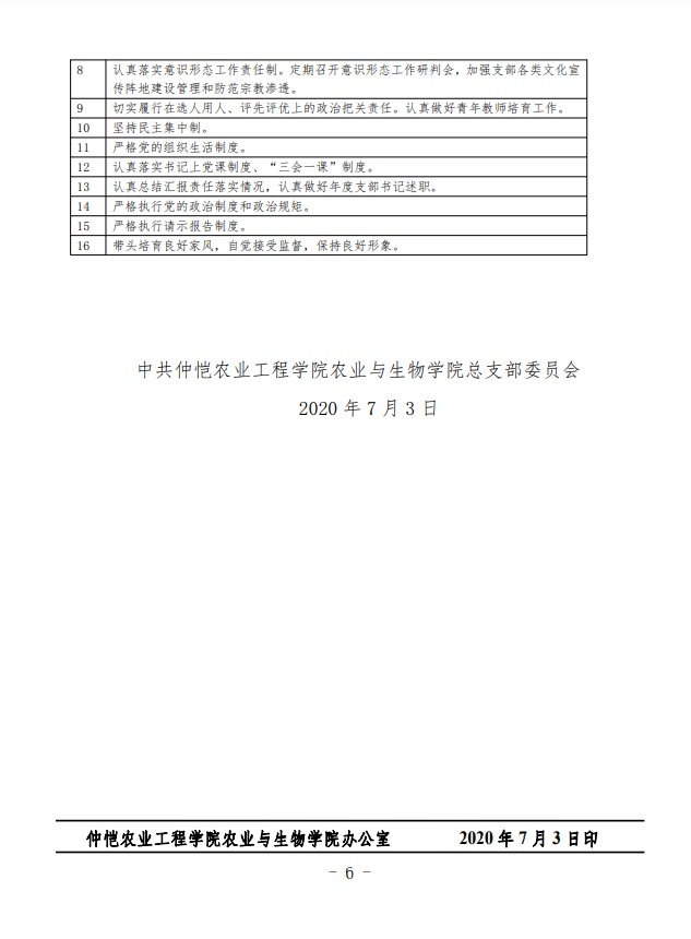 农生党字〔2020〕6 号-2020年william威廉中文党总支落实全面从严治党主体责任清单