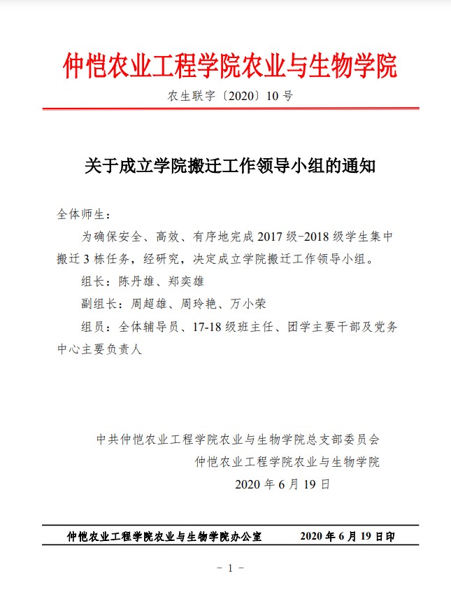 农生联字〔2020〕10号-关于成立学院搬迁工作领导小组的通知