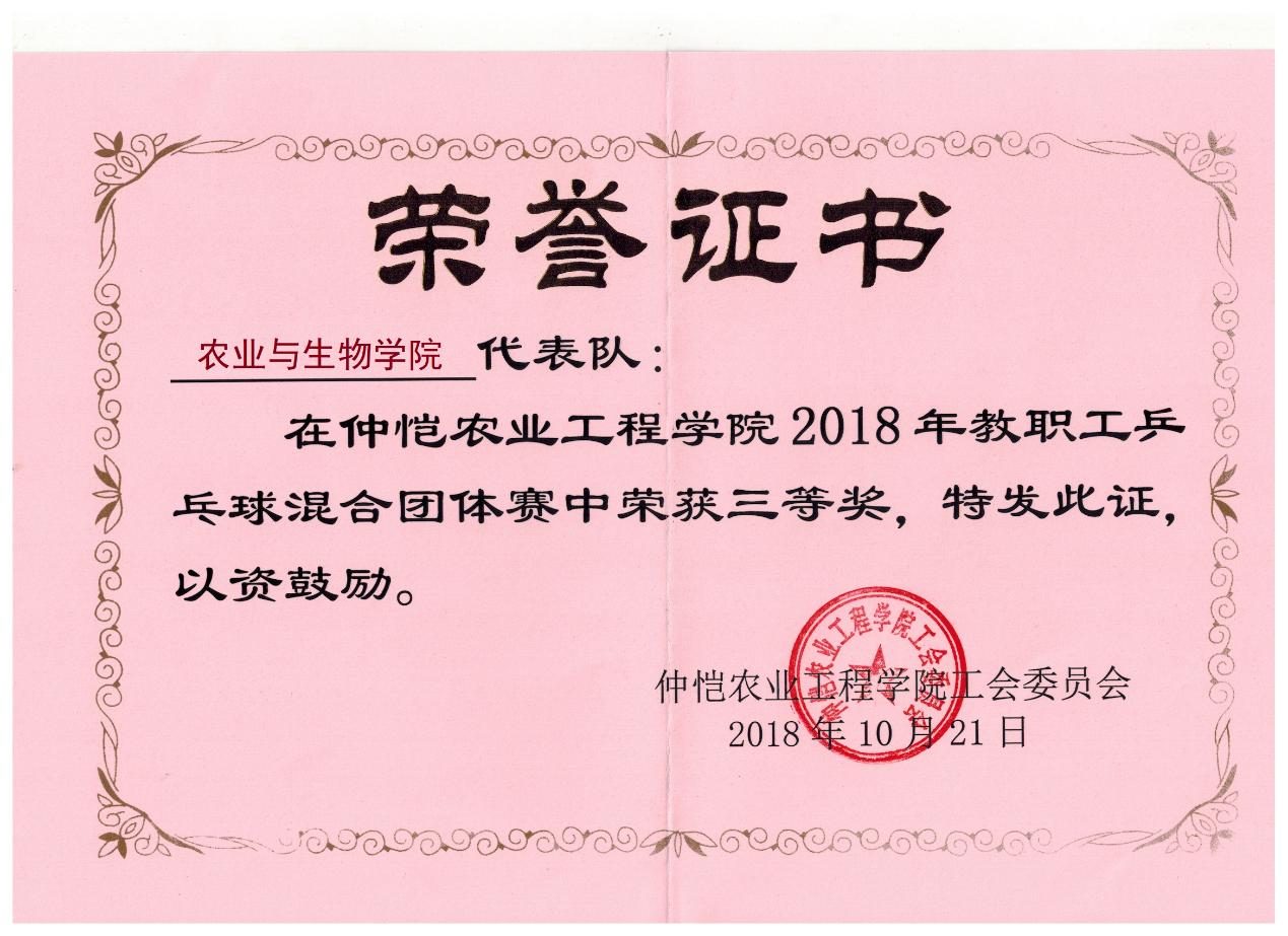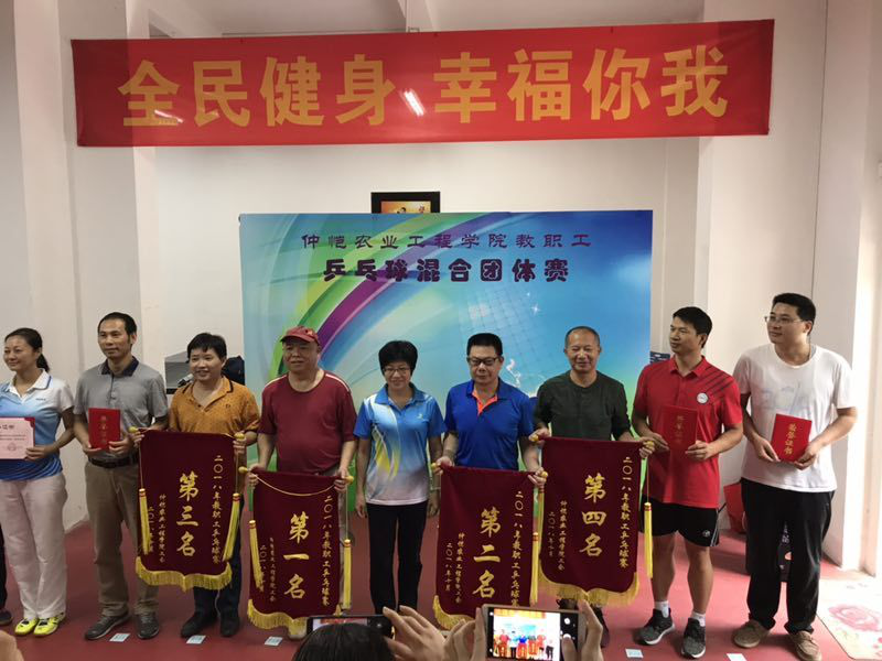 桂树飘香,稻田金黄,恰是一个丰收季。10月20-21日,在学院工会积极组织和工会主席梁佳勇的带领下,我院教工乒乓球队积极参加由学校工会组织的学校2018年教职工乒乓球混合团体赛。主力队员陈丹雄、万小荣、冯飞、罗梅、刘静、甘永红,替补队员梁佳勇,陈青春、余锋、游春平,队员们配合默契,表现出色,不负厚望,经过六轮激励角逐,斩获三等奖,获得了学院成立以来最好的成绩。经过此次比赛,既锻炼了身体,又促进了交流,打出了气势,赛出了风采。