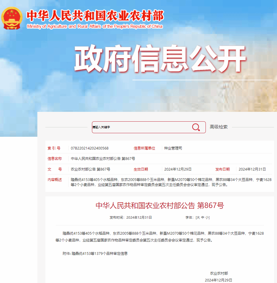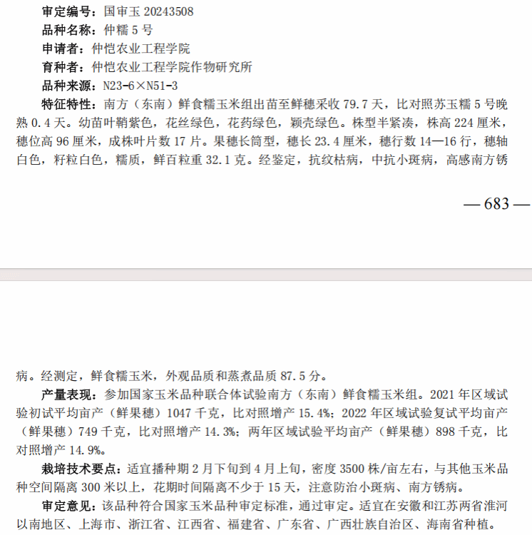 2024年12月29日,中华人民共和国农业农村部发布公告第867号。我校自主选育申请的糯玉米“仲糯5号”符合国家玉米品种审定标准,经第五届国家农作物品种审定委员会第 五次主任委员会会议审定通过,经农业农村部公示期满,予以公告。