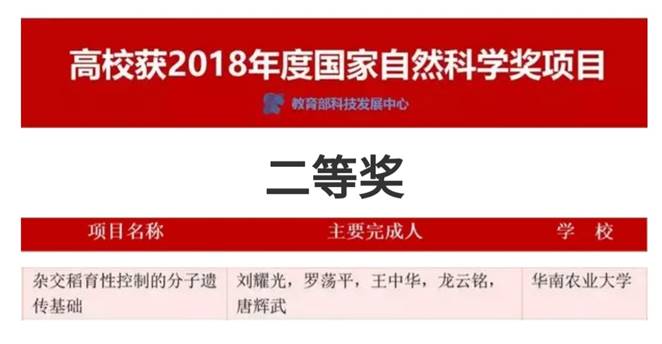 我院07届杰出校友唐辉武博士作为主要完成人所参与的项目的《杂交稻育性控制的分子遗传基础》荣获2018年度国家自然科学奖二等奖。