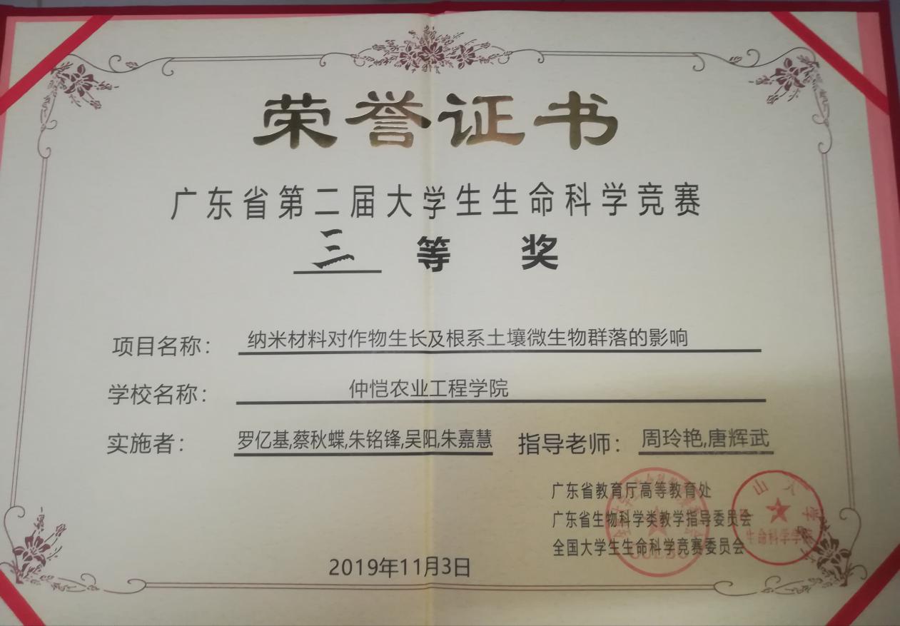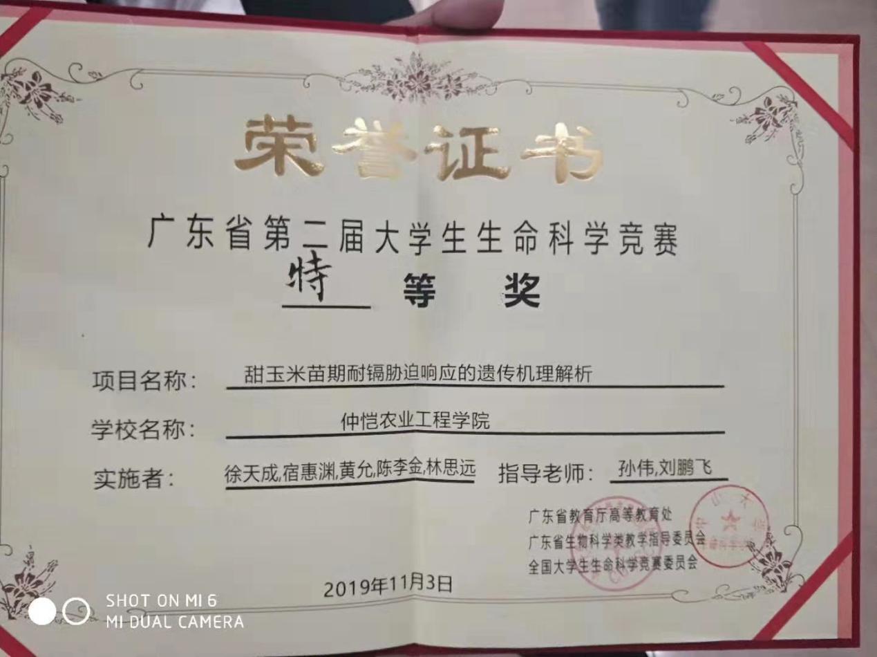 11月3日,第二届广东省大学生生命科学竞赛(第三届全国大学生生命科学竞赛广东省赛区复赛)在中山大学圆满落幕。在本次省赛中,我院有两支队伍脱颖而出。其中,由徐天成、陈李金、宿惠渊、黄允、林思远、高紫微组成的团队,在孙伟副教授和刘鹏飞副教授的悉心指导下,以研究项目《甜玉米苗期耐镉胁迫响应的遗传机理解析》荣获特等奖,该队伍将进入国赛,竞争国家一二等奖。除此之外,我院另一支由罗亿基、蔡秋蝶、朱嘉慧、朱铭锋、吴阳等5位同学组成的队伍,在周玲艳教授和唐辉武副教授的悉心指导下,以研究项目《纳米材料对作物生长及根系土壤微生物群落的影响》荣获本次竞赛三等奖。