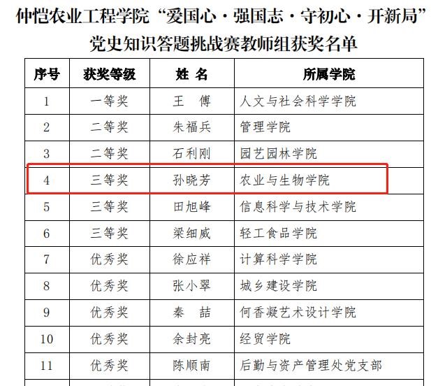 根据《关于举办“爱国心·强国志·守初心·开新局”党史知识答题挑战赛学生组决赛暨颁奖仪式的通知》(仲学组办字〔2021〕3号)内容,我院孙晓芳老师在我校“爱国心·强国志·守初心·开新局” 党史知识答题挑战赛教师组比赛中,取得了三等奖的佳绩。