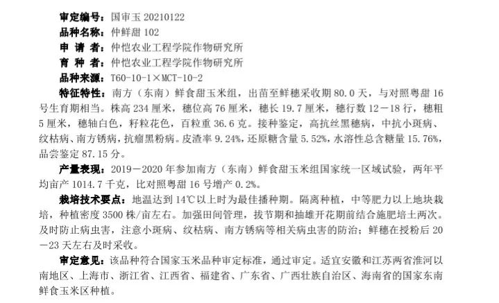 2021年12月31日,中华人民共和国农业农村部发布结果公告第500号。我校作物研究所申请的甜玉米“仲鲜甜102”符合国家玉米品种审定标准,经第四届国家农作物品种审定委员会第八次会议审定通过 ,证书编号:国审玉20210122 ,予以公告。这是一种莫大的荣誉与激励,新的一年,我校将继续发扬积极进取的开拓精神,加大研发力度,培育更多高产优质品种,为国家增产增收,作出更大贡献。