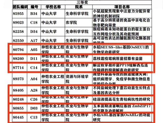 其中,我院《广藿香根茎腐病的病原鉴定、快速检测及其生防木霉菌的筛选》获得全国大学生生命科学竞赛广东赛区一等奖,并入围全国决赛;此外,我院项目《水稻SEUSS-like基因OsSEU1的生物学功能研究》、《荔枝霜疫霉病原菌招募有益菌》、《解淀粉芽孢杆菌PP19缓解西瓜连作障碍的抑菌解毒功能研究》、《不同盐碱处理下薏苡幼苗生长特点及基因表达分析》、《硅溶液提高花生青枯病抗性的研究》、《玉米苗期渍害响应基因 ZmbZIP17的克隆及功能解析》、《水稻AHL基因家族OsAHLc的功能研究》分别获全国大学生生命科学竞赛广东赛区三等奖。