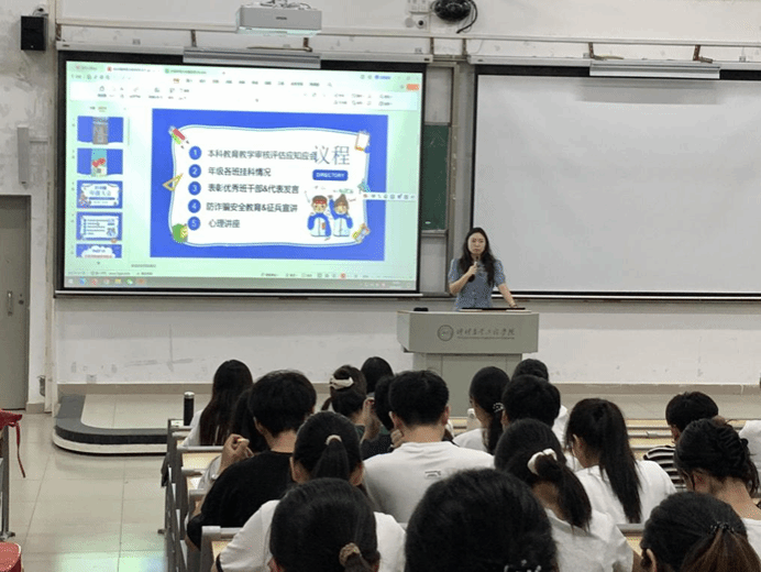 紧接着,邝健睿老师围绕学校新一轮本科教育教学审核评估工作,开展“迎评应知应会”专题宣讲。她结合《本科教育教学审核评估知识手册(学生版)》核心内容,明确告知同学们:学校将于2025年10-11月迎接教育部审核评估。她特别强调评估对学生的重要意义,希望同学们熟悉校史校情、严守校纪校规,以主人翁姿态和良好的精神风貌积极参与学校评建活动,配合完成线上评估等相关工作。