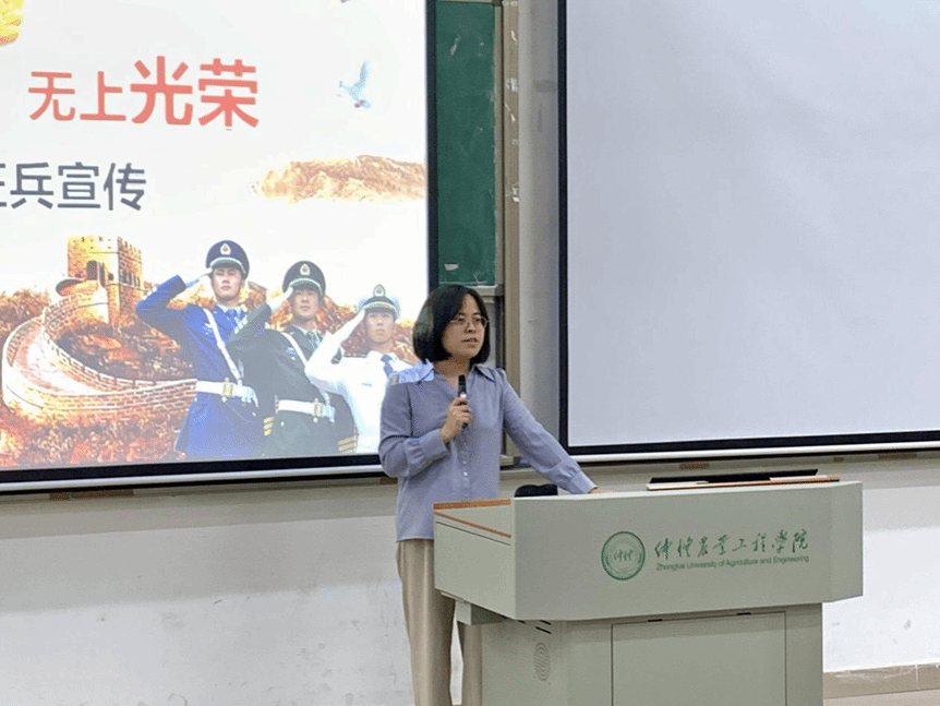 “一身戎装,一生荣光!”在征兵动员环节,孙晓芳老师开展专题宣讲,围绕“大学生参军报国”的核心,从政策、流程、前景三个维度为同学们答疑解惑。