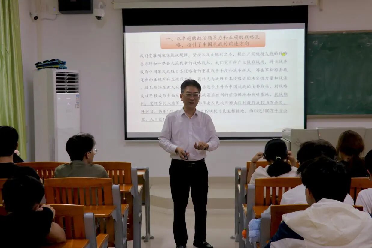 课程最后,周超雄书记语重心长地发出号召:青年一代是推进中国式现代化、实现民族复兴的生力军,抗战先辈用鲜血和生命守护的家国,需要当代青年用知识和实干去建设。希望大家将伟大抗战精神内化于心、外化于行,在课堂上专注求知,在实践中锤炼本领,不辜负时代的召唤、学校的培养与自己的青春,以担当作为的姿态,在强国建设的征程中书写属于这一代人的无悔答卷。