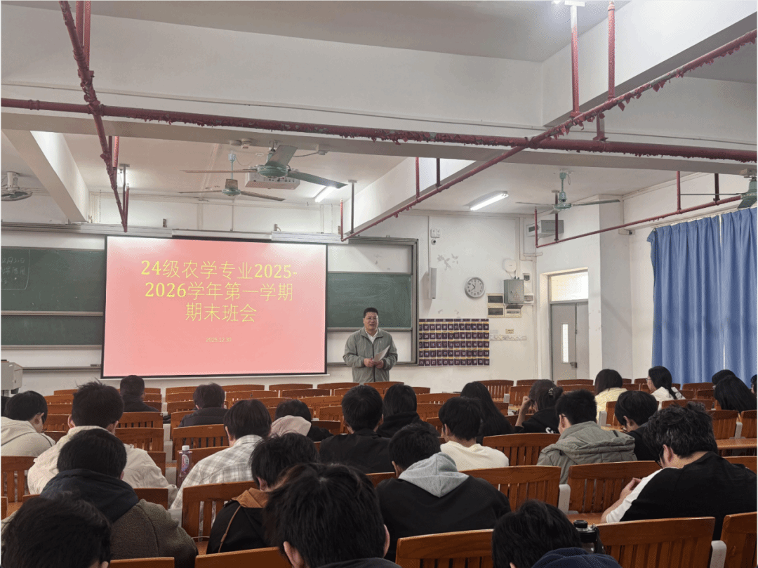 2025年12月30日2024级农学专业在教二512教室召开了2025-2026学年上学期期末班会,本次班会旨在对本学期班级情况进行总结和梳理,对于考试周和寒假的叮嘱和鼓劲。会议由班主任陈青春老师主持。