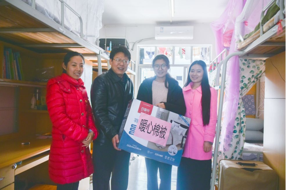 冷空气降临,气温骤降,为帮助贫困学子温暖过冬,学生处举办了“送温暖”活动。本次活动由学生处资助中心牵头,我院积极响应学生处的号召,12月11日中午,william威廉中文党总支书记陈丹雄,辅导员周静静、王汝婷一起深入学生宿舍,亲手将爱心棉被送给该院家庭经济困难的学生。