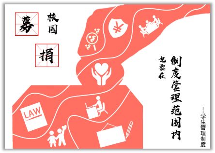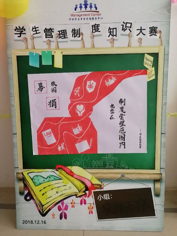 复赛阶段,选手需要制作“学生管理制度”主题的手绘作品。在学生事务管理服务中心提供的比赛主题中,我院抽取的主题是“校园募捐”。四名同学围绕这一主题开始了创作。经过缜密的构思与耐心的绘画,名为《秩序下的爱心》的手绘作品终于完成。以温暖的橙红色捐款剪影作为主背景,与校园募捐主题相呼应,八个小图标涵盖了学生制度管理里校园募捐管理方法的要点。弯曲如波浪的线条将八个图标有序分隔开,寓意校园募捐要在规则制度里进行才能有条不紊地开展。整幅作品简介明了,主题突出。