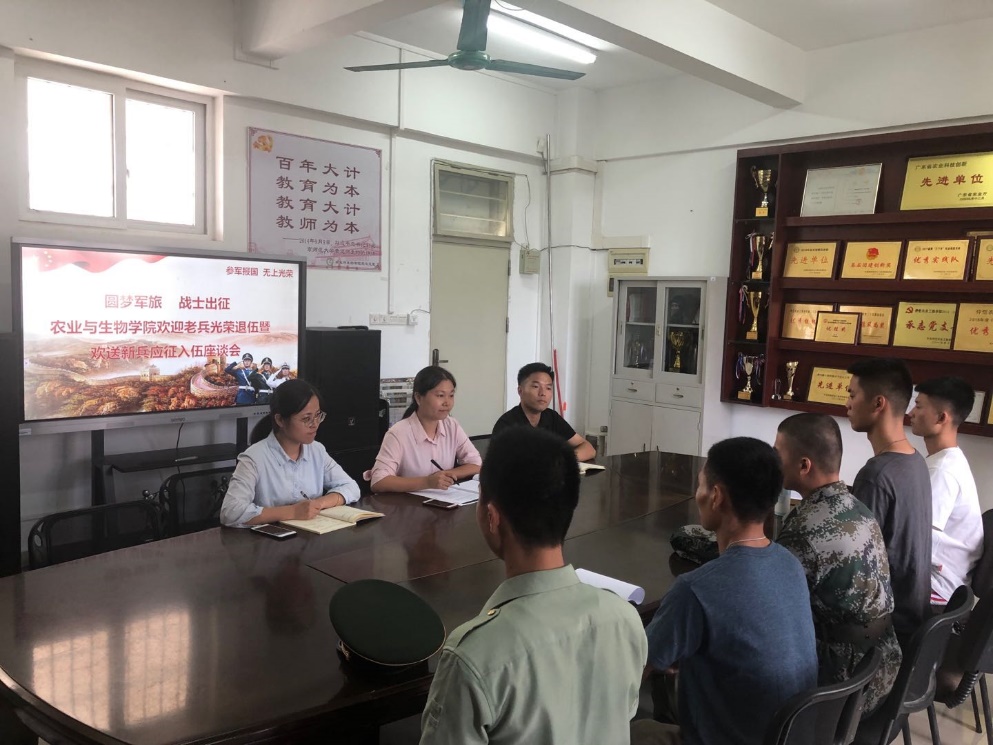 最后,高结怡代表学院欢迎四名老兵载誉归来,同时祝贺即将奔赴军营的新兵成为中国人民解放军的光荣一员。高结怡指出,退伍军人是仲园里一道“亮丽的风景线”,经历了军旅的洗礼,从身体到意志获得了全面的成长与进步,相信每一位退伍同学都能在学习和生活中展现出农生人的出色和精彩。她希望入伍新兵勇于面对军营的挑战,在磨练中获得进步,仲恺农生院永远是他最坚强的后盾。三位老师共同带领大家重温了2017年9月《习近平总书记给南开大学8名新入伍大学生的回信》,希望所有退伍老兵和新兵同学牢记习近平总书记的嘱托,无论是在军营中还是校园里,都牢记自身使命,努力为国家建设、军队发展,为中华民族伟大复兴做出自己的贡献。