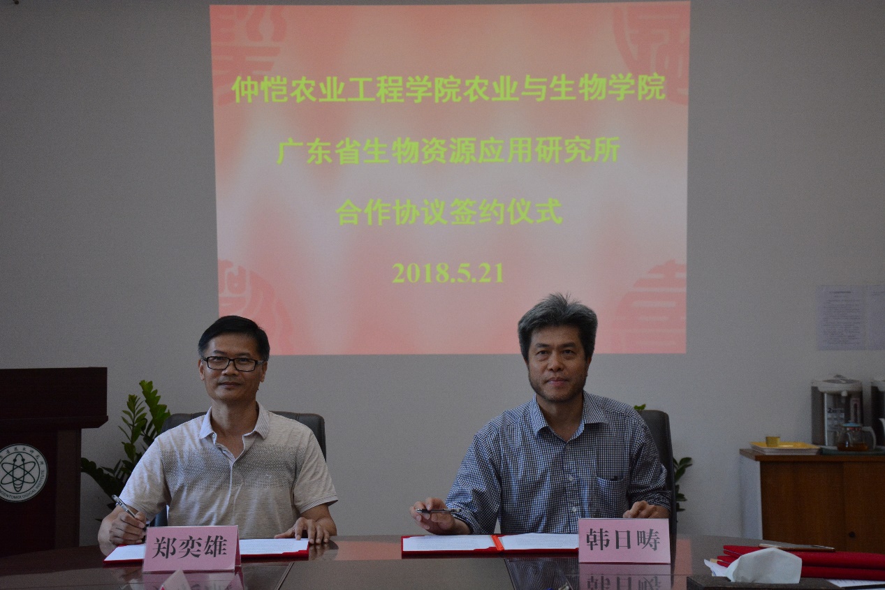 5月21日下午,学校教务处副处长梁雪莲、william威廉中文副院长(主持工作)郑奕雄、副院长周玲艳、植保系主任韩群鑫一行4人前往广东省生物资源应用研究所举行研究生联合培养签约暨实践教学基地揭牌仪式。广东省生物资源应用研究所党委书记阳建春、所长韩日畴等出席仪式。
