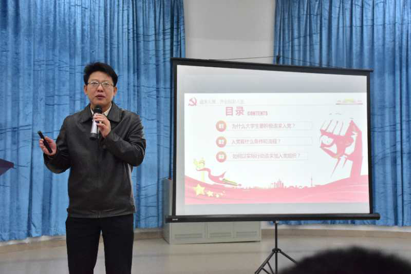 随后,由陈丹雄书记带来《追求入党,精彩人生》专题讲座。陈书记从为什么要积极追求入党、入党的条件和入党的实际行动三个方面来进行讲解。第一,积极追求入党涉及到人的动机和理想,党组织有许许多多优秀的党员,若将自己与优秀的党员比较就能给自身动力,不断地朝着为实现中华民族伟大复兴这一中国梦奋进,从而孕育出人生价值。第二,陈书记指出,年满十八岁的青年都可以自愿加入中国共产党。若有入党的想法就要付出实际行动,要做到思想上进,有进取心,积极学习习近平新时代中国特色社会主义思想,同时学习成绩要优秀,工作积极,要有很好的综合素质,要在平时生活中不断历练,不断地雕琢自己,使自己成才。最后,陈书记指出,做合格党员永远在路上,大学生要坚守底线,长期坚持,党的大门永远向有理想、有信念的有志青年敞开。
