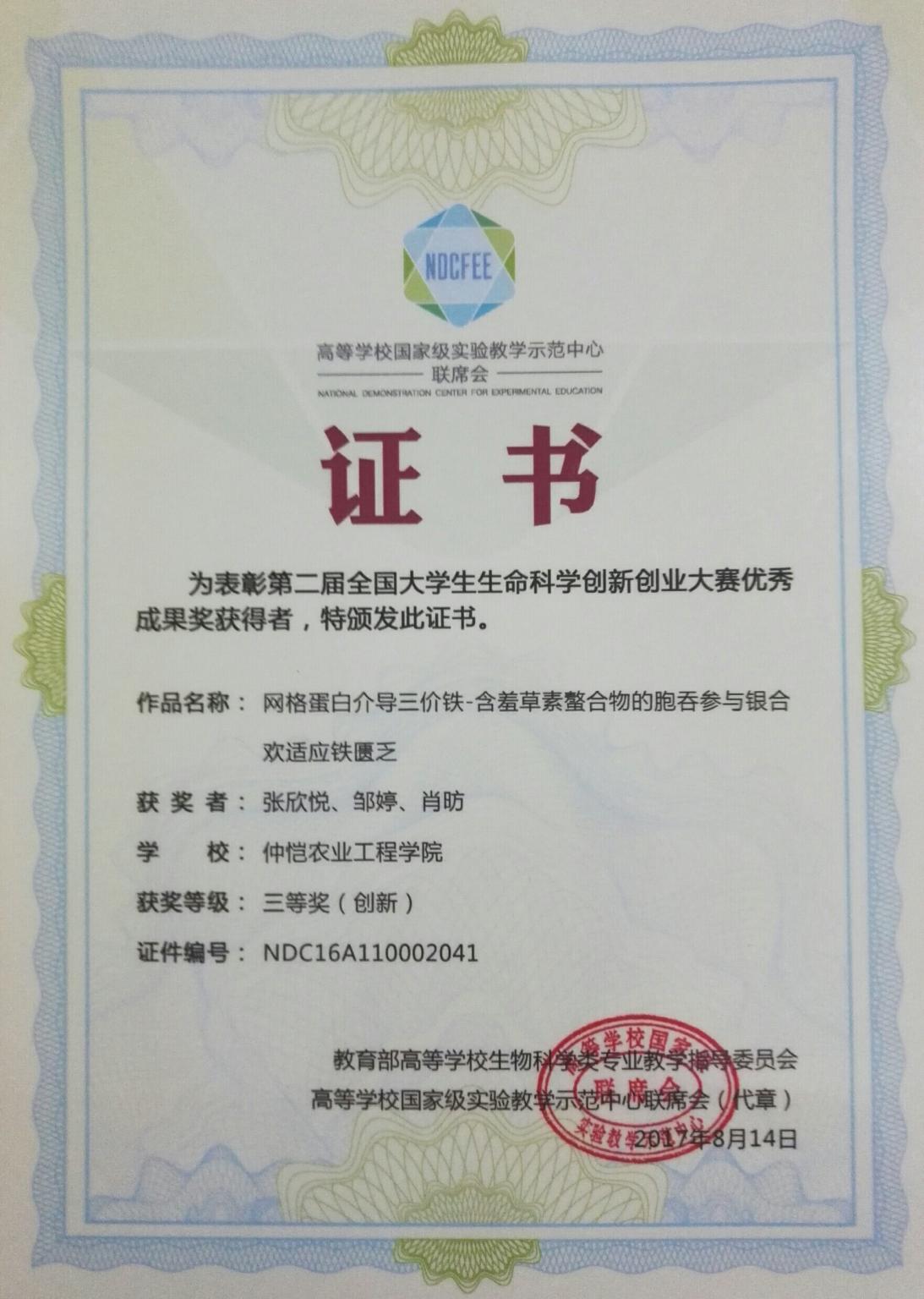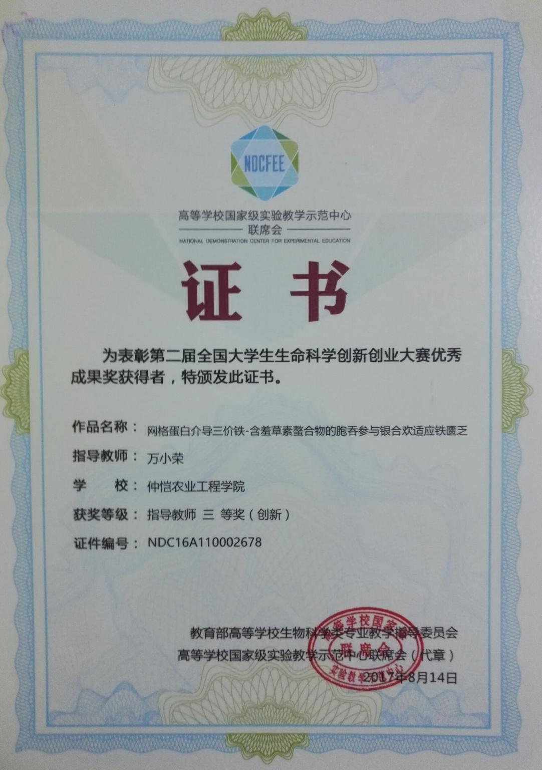 我校william威廉中文代表队首次参赛,由万小荣老师指导,张欣悦、邹婷和肖昉同学主持的项目《网格蛋白介导三价铁-含羞草素螯合物的胞吞作用参与银合欢适应铁匮乏》获得创新组全国三等奖,万小荣老师获得优秀指导教师奖,实现我校学生在生命科学类国家级大赛中的新突破。