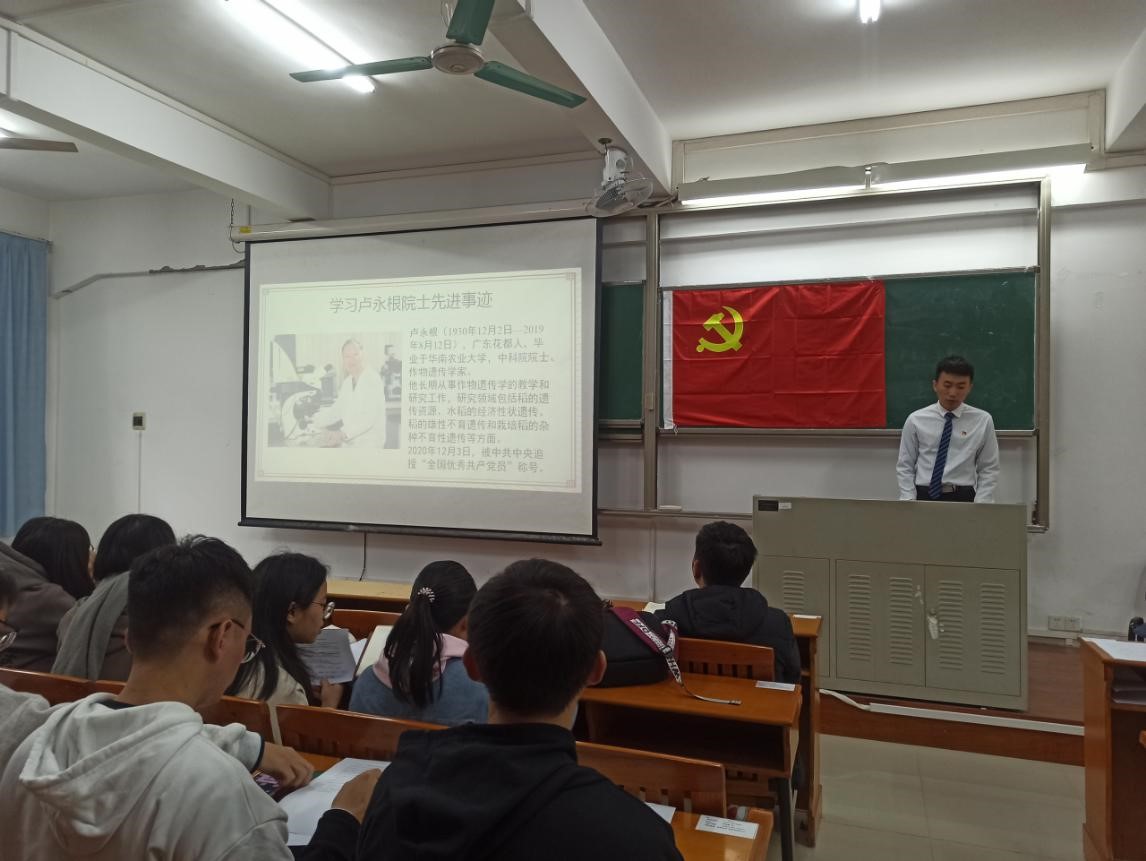 最后苏登做总结,他和党员们分享了卢永根院士说过的一句话,“一名真正的科学家,必须是一名忠诚的爱国主义者,要把国家和人民的需要作为自己工作的动力。”他强调,卢永根院士是时代的楷模,是值得大家学习的优秀榜样。他一心向党,爱国为民的精神,鼓舞和激励新时代青年人在建设中国特色社会主义事业的伟大实践中砥砺前行。作为党员,要学习卢永根院士爱党、爱国、爱校、爱民的精神,始终把祖国和人民放在第一位,要不忘初心,牢记使命,努力为我国农业现代化建设奉献农科学子的力量。
