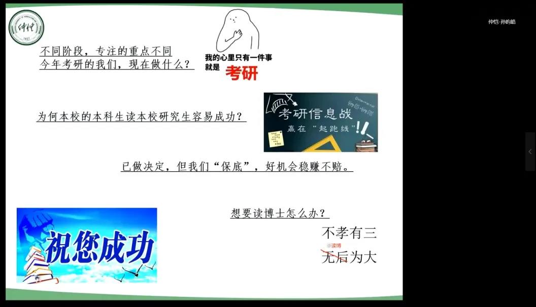 最后,孙昀皓老师为考研注意事项作了细节补充,阐明考取本校研究生的优势及意义,重点提醒大家注意好英语分数,避免因不过线而失去机遇。在勇往直前的同时,也要注意好自身退路,应记住:“仲恺永远是大家坚实的后盾。”